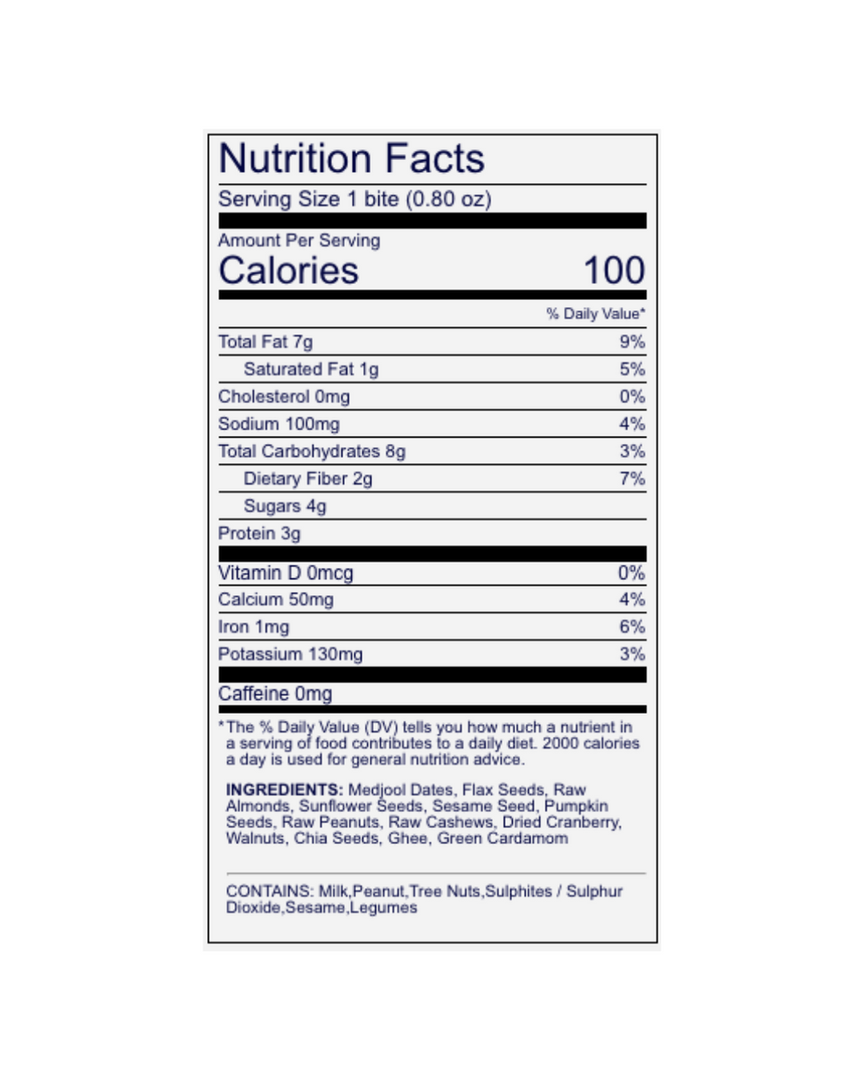 dates, dried cranberries, garden cress seeds, pumpkin seeds, sunflower seeds, peanuts, walnuts, almonds, cashew nuts, chia seeds, sesame seeds, flax seeds, cardamom powder, ghee